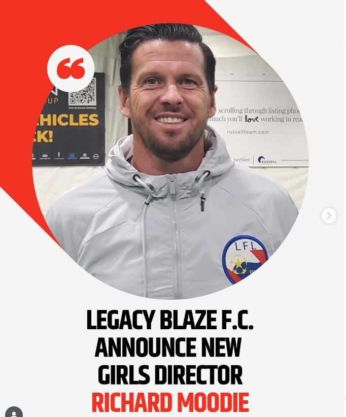 "I am thrilled to be coaching at Legacy Blaze FC alongside Coach Jorge! As a staff, our mission is to invest in the community and create a positive, safe environment where growth and development thrive. Looking forward to getting involved!" -Richard Moodie.